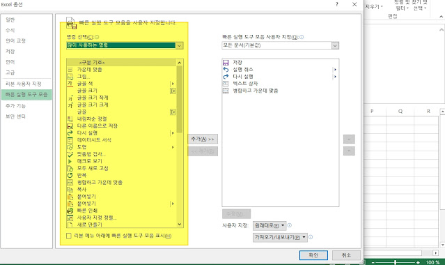 자주쓰는 명령어는 이렇게 단축키를 설정해놓는 것을 추천하는 것이 엑셀을 함에 있어서 편리하다.